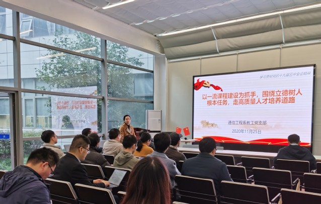 为认真学习贯彻党的十九届五中全会精神,落实立德树人根本任务,2020年11月25日下午,通信工程系教工党支部开展 “以一流课程建设为抓手,围绕立德树人根本任务,走高质量人才培养道路”主题党日活动,公司“立德树人教师团队”刘一清教授和沈昕老师作团队工作与课程建设经验分享报告。活动由通信工程系教工党支部书记周梅主持。