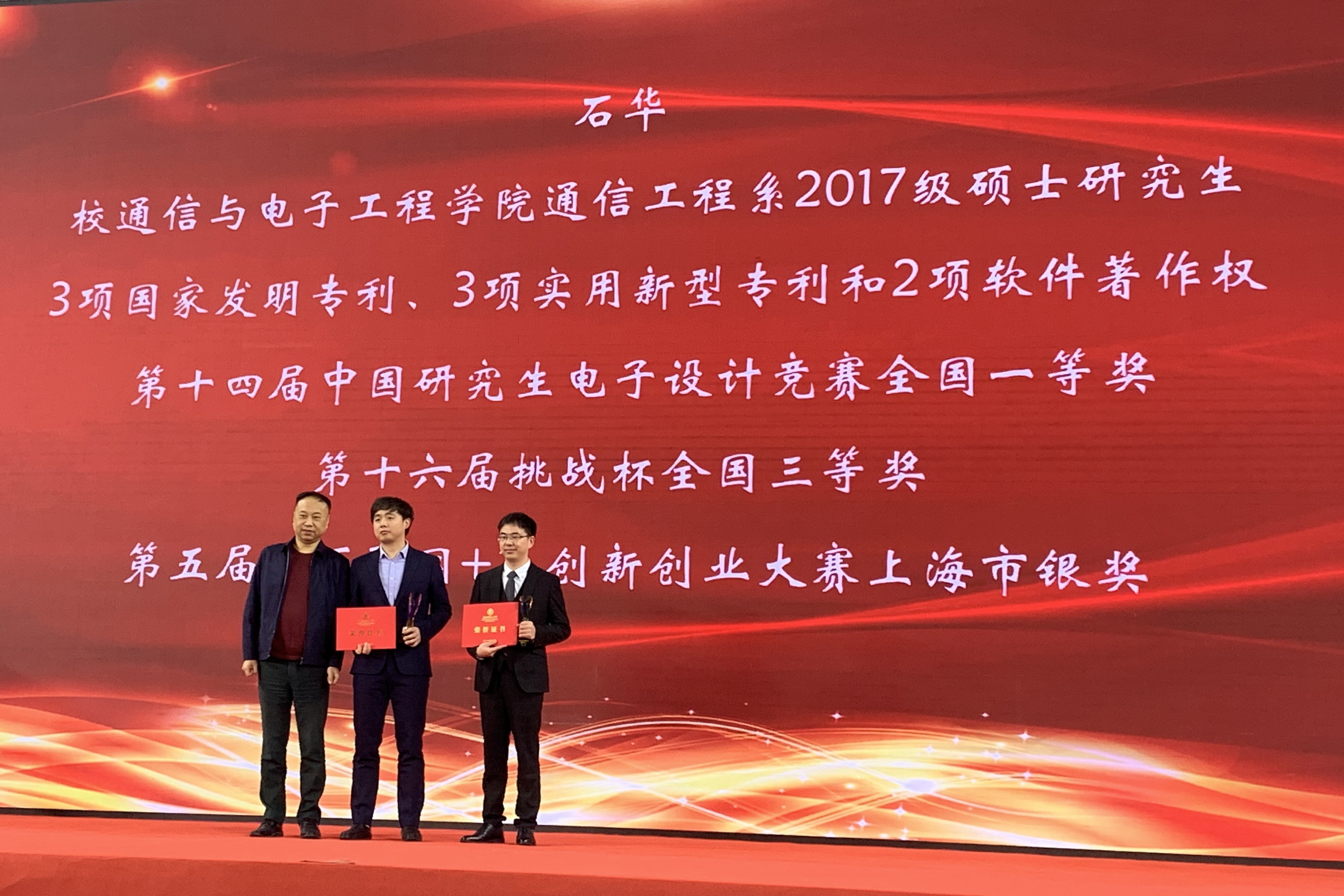 通信与信息系统专业石华同学荣获“科创达人”称号,他连续两届参加中国研究生电子设计竞赛,获得全国一等奖;荣获第十六届挑战杯全国三等奖,上海市一等奖;带队参加第五届互联网+老员工创新创业大赛,获得上海市银奖。以第一作者身份申请国家发明专利3项、实用新型专利3项和软件著作权2项。