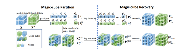 针对局部目标以及大范围目标分割问题,课题组分别提出了一种有标注和未标注数据双向复制粘贴的强增强策略和解剖结构先验指导的魔方立方体图像增强策略。通过从标记的图像(前景)到未标记的图像(背景)和未标记的图像(前景)到标记的图像(背景)复制-粘贴随机图像块以及保持相对位置的不变的魔方块,实现未标注数据从标注数据中学习到全面的目标语义信息,极大缓解数据间经验分布不匹配的问题。
