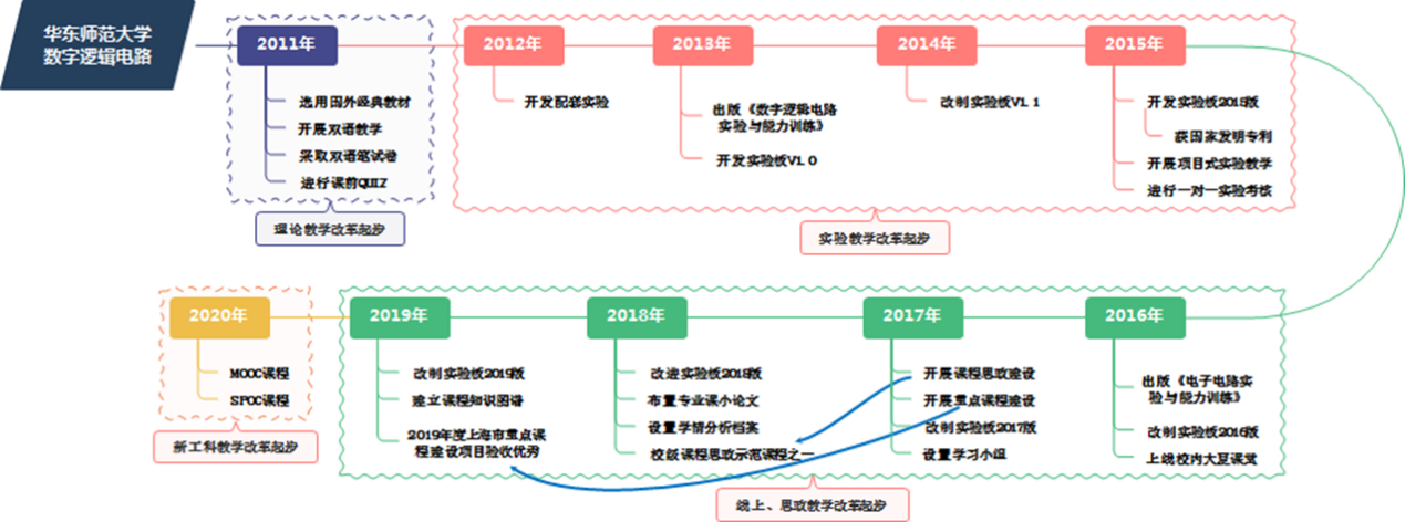 《数字逻辑电路及实验》既有很强的理论性,又具有很强的工程实践性,是电子信息类本科生的核心基础课程。刘一清教授带领他的教学团队从2011年开始对《数字逻辑电路及实验》的教法和模式进行持续地改革和提升,这个过程大致划分为四个阶段:2011~2012年间,是理论教学改革阶段,通过引入国外经典教材、开展双语教学、进行课前quiz考察等措施,不断进行理论教学的创新和改革;2013~2015年间,进入实验教学改革阶段,在此期间教学团队自主编写了实验教材和开发了配套实验板(获国家发明专利),并在实验课程教法和实验考核方式方面也开展了多项有益的改革探索;2016~2019年间,教学团队将教学理念进一步发展和提升,教学教改思路不再仅聚焦于某个具体点,而是将专业教育与思政教育相结合,对课程教学改革工作进行了全面梳理和重新规划,由此进入思政教学改革的综合发展阶段,在此期间课程于2018年获批成为402永利集团首批思政教育示范性课程之一,并且获得2019年度上海市重点课程建设项目验收优秀课程的殊荣;至2020年起,教学团队又将建设新工科课程作为今后的发展目标,开展了SPOC教学和MOOC教学的新探索,对标上海高校一流本科课程-线下一流课程建设标准。十年间,课程的教学思想每年都在提炼、教学方法每年都在提升、教学形式每年都在改进,教学团队真正做到了把课内课外相结合、把中文与英文相结合、把理论与实践相结合、把线上与线下相结合、把课程教学与科创实践相结合、把专业教育与思政教育相结合、还通过助教工作还把本科教学与公司产品相结合。