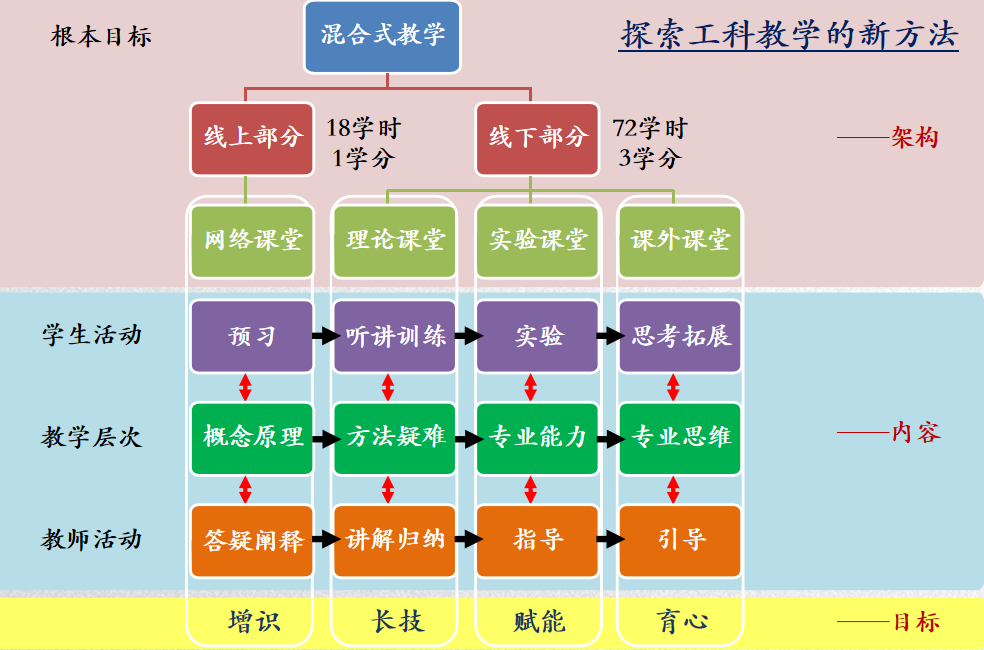 教学团队将教学目标细化为“增识、长技、赋能、育心”四个层次,分别对应掌握基本概念和基本原理、掌握专业方法、培养专业能力,以及提炼专业思维等等,逐级递进。为了引导员工实现上述教学目标,教学团队进一步实施了新的教学方法:“以物理为基础、以数学为工具、在实践中把握方法、在探索中培养能力、在思考中提升思想境界”,并改革了具体的课程架构和教学活动作为支撑。