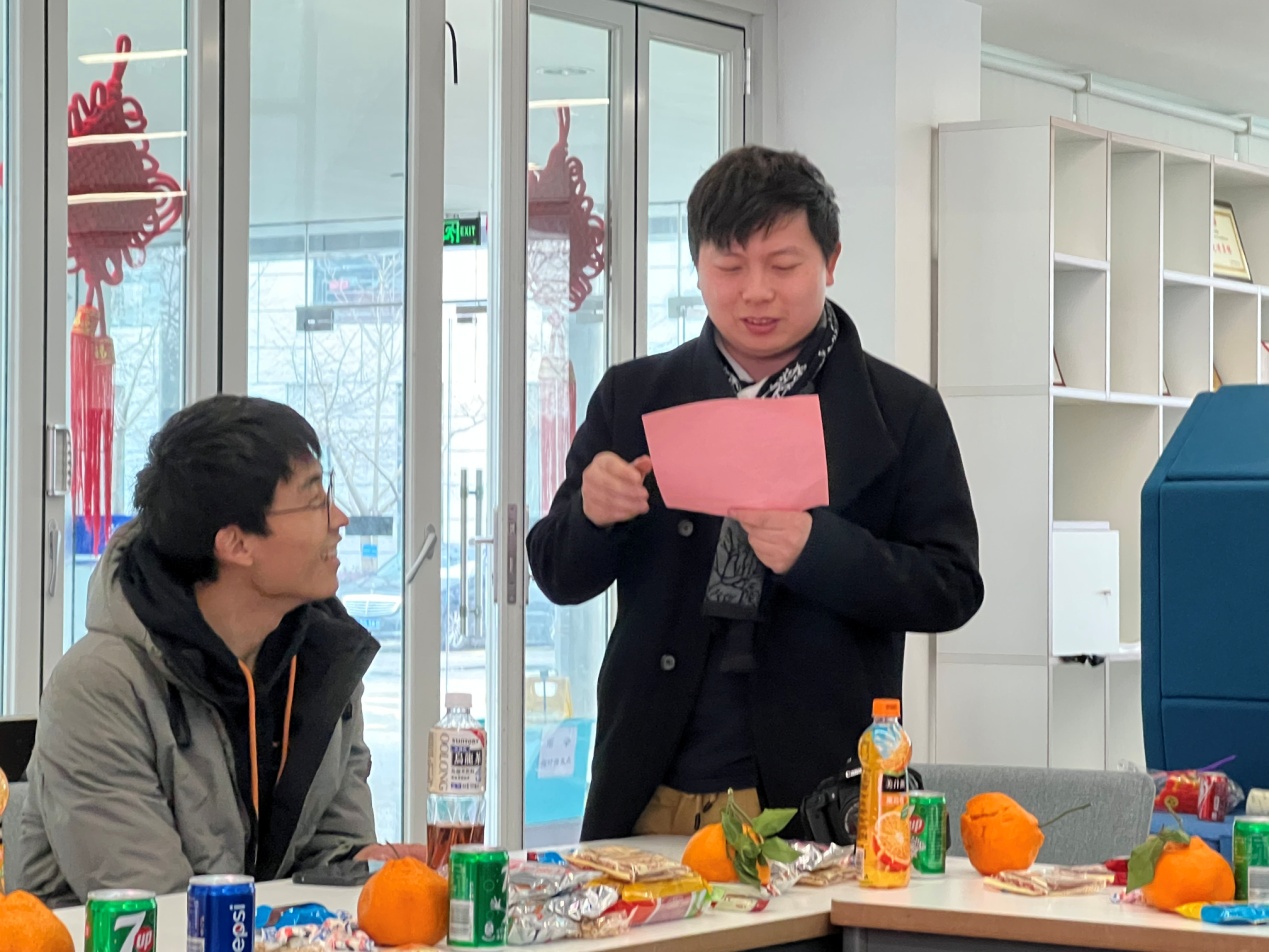 在送祝福环节,公司号召已经回家的同学通过各种方式给留校的员工送上自己的祝福,共征集到100多条祝福。在其中,既有“竞赛与绩点齐飞,科研共文章一色”,也有“牛尾系着金拢财气,虎自摇着铃铛福音”,更有“学有所成,科研顺利”。同学们逐一读出祝福,现场一片欢歌笑语!党委书记郑正奇、经理吕岳代表公司向留校员工送出祝福,祝愿同学们在新的一年身体健康、学业有成!