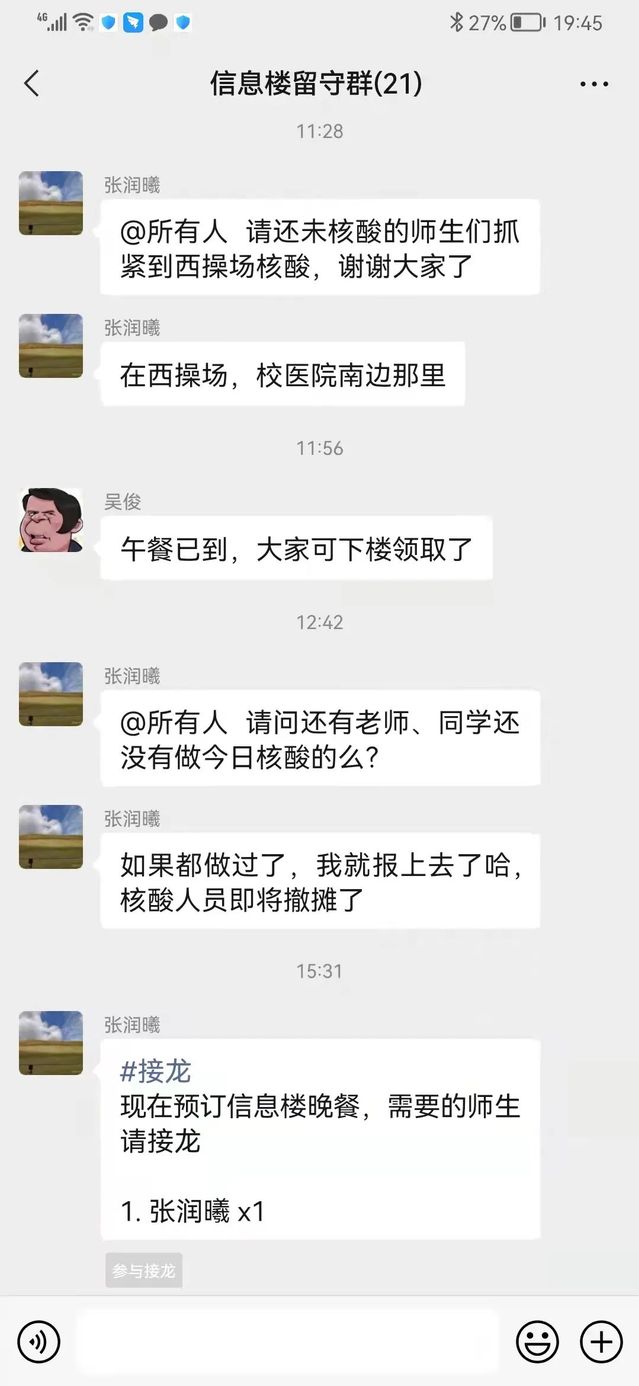 张润曦教授因为科研项目时间紧张,同时为了在公司更好地准备网课,留在了信息楼,临“危”受命成了信息楼的“楼长”,一名党员就是一面旗帜,张润曦教授发挥党员模范带头作用,建起了信息楼留守群,和同学们一起在信息楼“安家”,通知被封在信息楼的通信公司和物理公司的师生们用餐和做核酸。封闭期间张润曦教授带领项目组取得了“华为杯”第四届中国研究生创“芯”大赛全国最高奖创芯之星、全国优秀组织奖、格科微企业大奖全国一等奖1项、二等奖 4 项的优异成绩,张润曦教授荣获全国优秀指导教师奖。