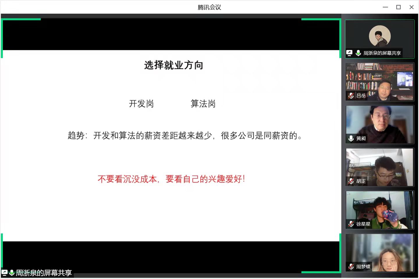 周浙泉、吴雄军、金志伟等三位研三同学分享了自己在求职过程中的宝贵经验和心得体会,并给其他同学提出了很多有价值的建议。周浙泉同学不仅普及了就业方面的术语,如sp、ssp、oc等,而且结合自身经历给出了有关就业方向、求职时间节点及面试准备的建议,提醒“没有收到正式的offer邮件之前一切皆有变数!不要松懈下来!不要停止面试”。