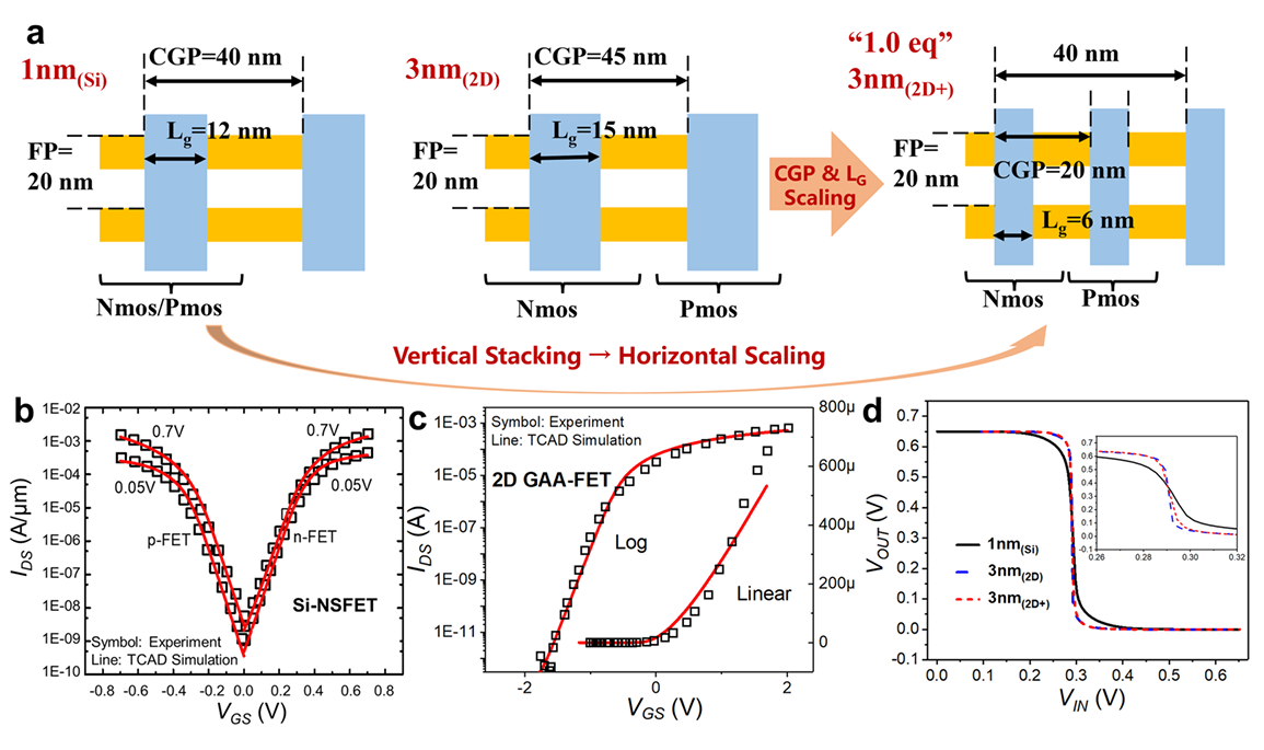 近日,402永利集团402永利集团(402永利集团)孙亚宾教授团队的沈阳副教授,联合清华大学集成电路公司田禾教授、复旦大学微电子公司的包文中教授,提出基于二维半导体沟道的“等效1 nm”技术方案(“2D eq 1 nm”),即基于纳米片晶体管NSFET工艺引入二维半导体,在性能、功耗和面积上与1 nm节点下的硅基CFET相匹配甚至优于后者,为后摩尔时代芯片技术发展提供了创新性解决方案。