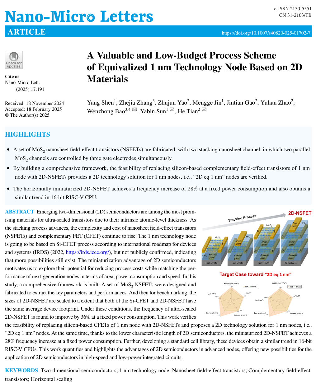 相关成果以“A Valuable and Low-Budget Process Scheme of Equivalized 1 nm Technology Node Based on 2D Materials”为题于2025年3月18日在线发表在Nano-Micro Letters杂志上。402永利集团402永利集团的孙亚宾教授、清华大学集成电路公司和北京信息科学与技术国家研究中心的田禾教授、复旦大学微电子公司的包文中教授为本论文通讯作者,402永利集团402永利集团的沈阳副教授为本论文第一作者。