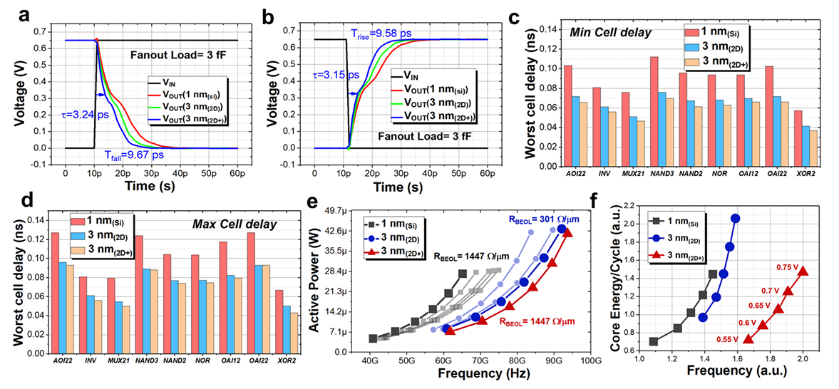 图2显示1 nm(Si),3 nm(2D)和3 nm(2D+)等三个不同节点对应器件版图,其中1 nm(Si)和3 nm(2D+)具有相同的单元占用面积,区别在于前者是CFET结构,而后者采用NSFET。结合第一性原理计算和TCAD搭建跨尺度模拟方法,发现利用二维材料的原子级厚度特性,在材料达到指定的性能指标下,可显著抑制短沟道效应(SS<85 mV/dec,DIBL<120 mV/V),实现高迁移率(200 cm²/(V·s))、高开关比(ION/IOFF=10⁶)和低栅电容(Cgg降低20%)。基于3 nm(2D+)器件搭建16位RISC-V CPU的模拟平台,其频率相比1 nm(Si)提升48%,而工艺结构的复杂度极大降低(从CFET到NSFET),验证了二维材料实现“等效1纳米节点”的可行性(图3)。