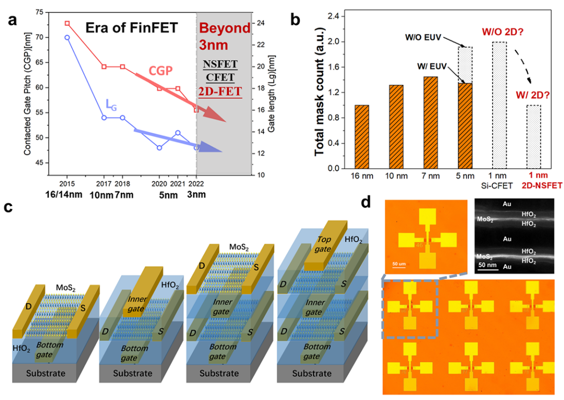 图1 (a)从16纳米到3纳米以下节点的栅极长度和器件栅极间距的演变;(b)总掩膜数量随技术节点的变化;(c)和(d) MoS2纳米片晶体管的制备流程以及表征图像