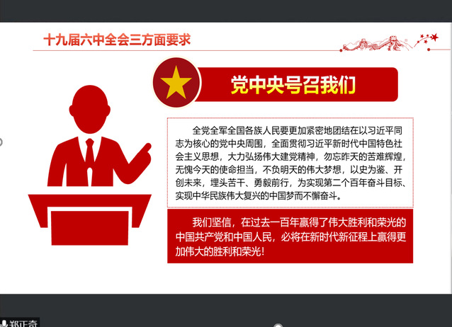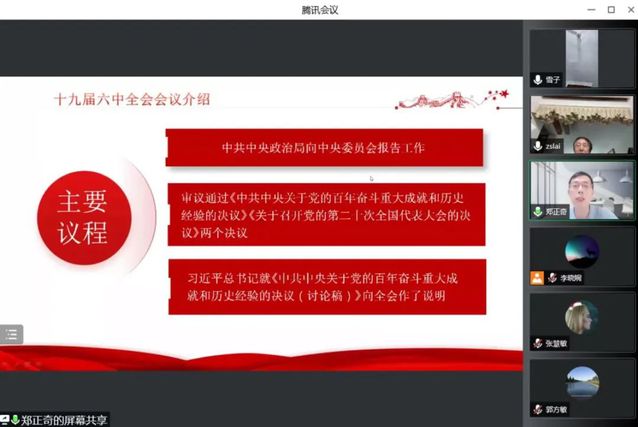 郑正奇书记详细介绍了十九届六中全会会议内容,深入阐述了为何要总结党的百年奋斗的重大成就和历史经验,回顾了中国共产党百年奋斗的历程,介绍了中国共产党百年奋斗的历史意义及宝贵经验和十九届六中全会三方面要求,希望师生党员把握历史发展大势,坚定理想信念,牢记初心使命,始终谦虚谨慎、不骄不躁、艰苦奋斗,为实现中华民族的伟大复兴贡献力量。