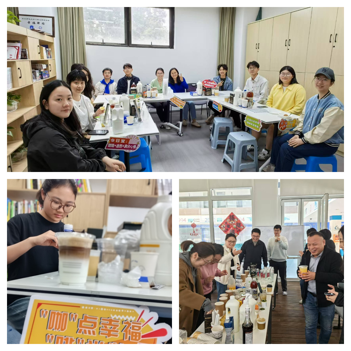 活动现场,工会与幸福驿站老师带领到场师生体验咖啡风味缔造的乐趣,当香醇的咖啡基底遇上不同的配料,就像打开了一扇扇通往不同情绪世界的大门。参与者可以自由选择牛奶、橙汁、红茶、厚椰乳、开心果酱等配料,调配出属于自己的“情绪特饮”——有人偏爱甜蜜的焦糖玛奇朵,享受愉悦感;有人选择微苦的美式,体验沉稳与专注;还有人尝试加入少许酒酿,感受“咸甜交织”的生活哲学。不同的咖啡配方,就像是不同的情绪调节剂。一杯咖啡的时间,不仅让味蕾得到满足,更让情绪在香气中缓缓舒展。