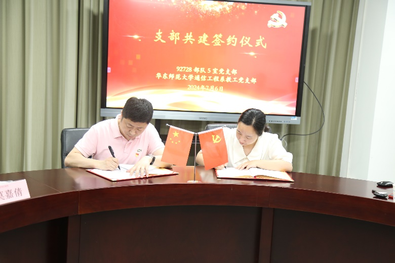 信与电子工程公司党委书记夏冰首先对丁宸聪书记一行的到来表示热烈欢迎,他向大家介绍了华东师大建校历程和办学历史以及公司的学科优势和人才培养理念等,希望以此次活动为契机加深在人才培养和科学研究等方面的深度合作,推进“一融双高”。92728部队5室党支部书记丁宸聪介绍了所在研究室与党支部的情况及未来发展规划,表示研究室与通信公司学科方向非常契合,可合作的切入点非常多,此次交流是双方合作的一个良好开端,进一步推动实现资源共享与共同发展。周梅详细介绍了信息与通信工程学科以及通信工程系教工党支部相关情况,汇报了近年与其他单位共建取得的初步成效,希望进一步扩大党建“朋友圈”,推动党建业务双提升。随后双方党支部书记签署了党建共建协议。
