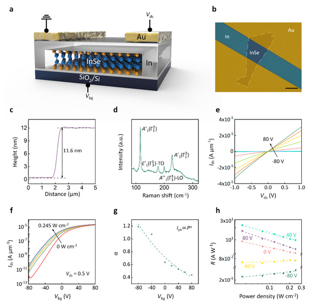 图1. InSe器件的表征、电学和光学特性
