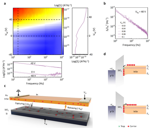 铟(In)层封装的InSe器件(图1a)基于表面电荷掺杂机制而具有高的开关比107、开态电流以及良好的欧姆接触(图1e,f),其迁移率高达3700 cm2 V-1 S-1,并且在405 nm激光照射下,器件的光响应强烈依赖于栅极电压。这种现象源于半导体沟道与介电层界面处存在缺陷态,在不同栅压下,缺陷态可以捕获和释放载流子,从而影响沟道电荷的有效传输(图1g)。