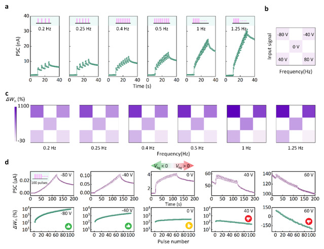 同时证明了突触可塑性与栅电压调控的依赖关系,当栅电压为负时,突触权重随脉冲频率和数量的增加而增加;栅电压为零时,突触权重基本不发生改变;而栅电压为正时,突触权重随脉冲频率和数量的增加而减小(图4a-d)。这三种突触权重的变化趋势可用于动态模拟患者在不同剂量药物作用下的有效/稳定/失效三种服药后的反应。