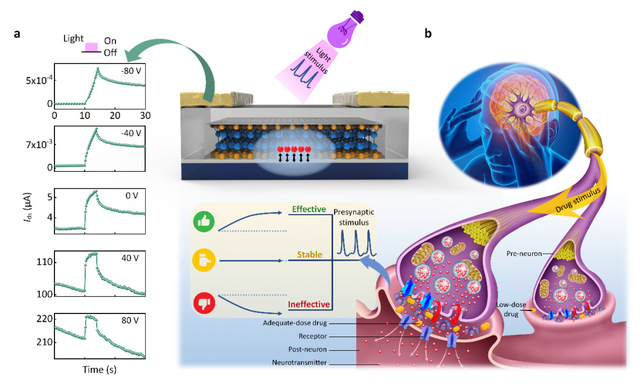在相同条件的光照下,通过栅电压的调控,可以实现对器件的输出电流进行调制(图2a)。将光照作为突触前膜输入刺激,栅电压作为药物剂量,输出电流作为后突触电流,InSe与介质层界面处的电子运输过程类似于生物突触中神经递质的释放,电子在该界面处的转移导致相应的神经突触行为。其中栅电压的负、零和正偏,分别对应药物剂量的足量、适量和少量,并会产生药物作用后有效/稳定/失效三种反应(图2b)。