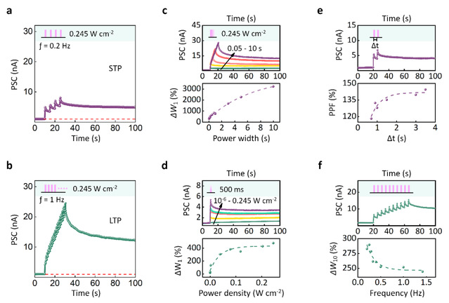 随后进一步证明了InSe人工突触基本的可塑性,包括短程可塑性和长程可塑性(图3a,b),以及随着突触前膜脉冲刺激的持续时间和强度的增加,可实现短程可塑性到长程可塑性的转化(图3c,d);并计算得到了成对脉冲易化曲线和连续十个脉冲后突触后电流的变化曲线,可发现随着脉冲间隔时间的增加,PPF逐渐增加并饱和(图3e),当脉冲频率增大时,突触权重逐渐减小并趋于饱和(图3f)。