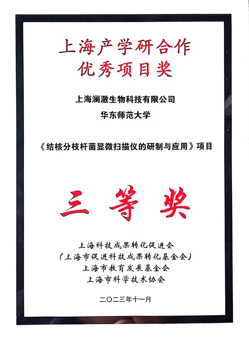 近日,2023年“上海产学研合作优秀项目奖”表彰大会在上海市政协举行,全市共有40个项目获奖,公司刘洪英老师与上海澜澈生物科技有限公司合作的《结核分枝杆菌显微扫描仪的研制与应用》项目荣获三等奖。
