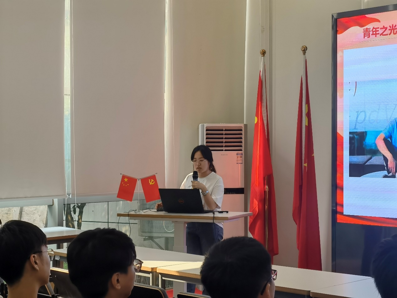 集成电路工程班团支书蒋欣怡同学为大家介绍了两位青年之光——曹原和葛曼棋,讲述了他们的经历和故事,并通过视频和图片等形式为大家带来了一场精彩的分享。分享中,蒋同学表达了新时代的中国青年要以实现中华民族伟大复兴为己任,增强做中国人的志气、骨气、底气,希望同学们能够共勉,共同做到不负时代,不负韶华,不负党的殷切希望。