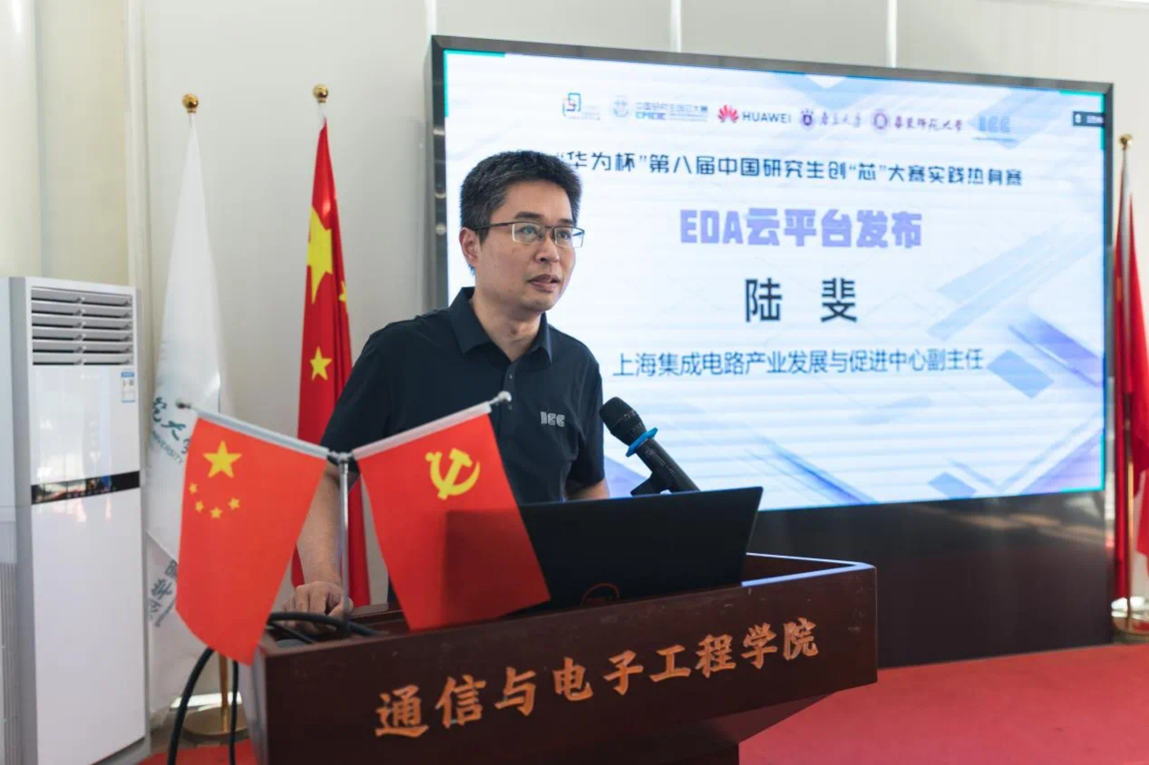 上海集成电路技术与产业促进中心副主任陆斐在启动仪式上介绍EDA云平台。该平台不仅为本次实践热身赛提供了有力支持,未来更将持续助力构建集成电路人才培养环节的新生态。