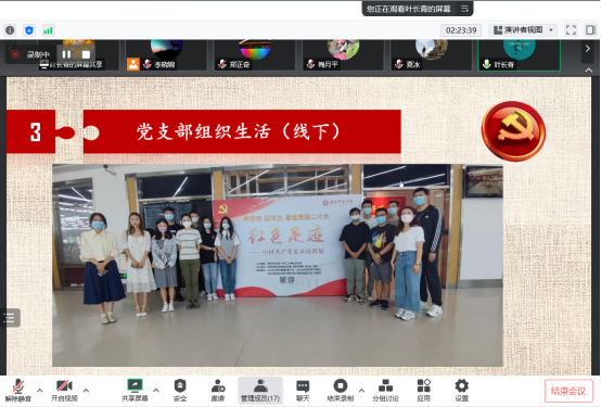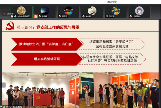 行政教工党支部书记张颖芳汇报了支部党员在疫情中所作的工作,坚持支部党建与行政管理服务有机融合,努力做好师生“润滑剂”,画好同心圆,全面助力公司工会、团委和双创等工作。