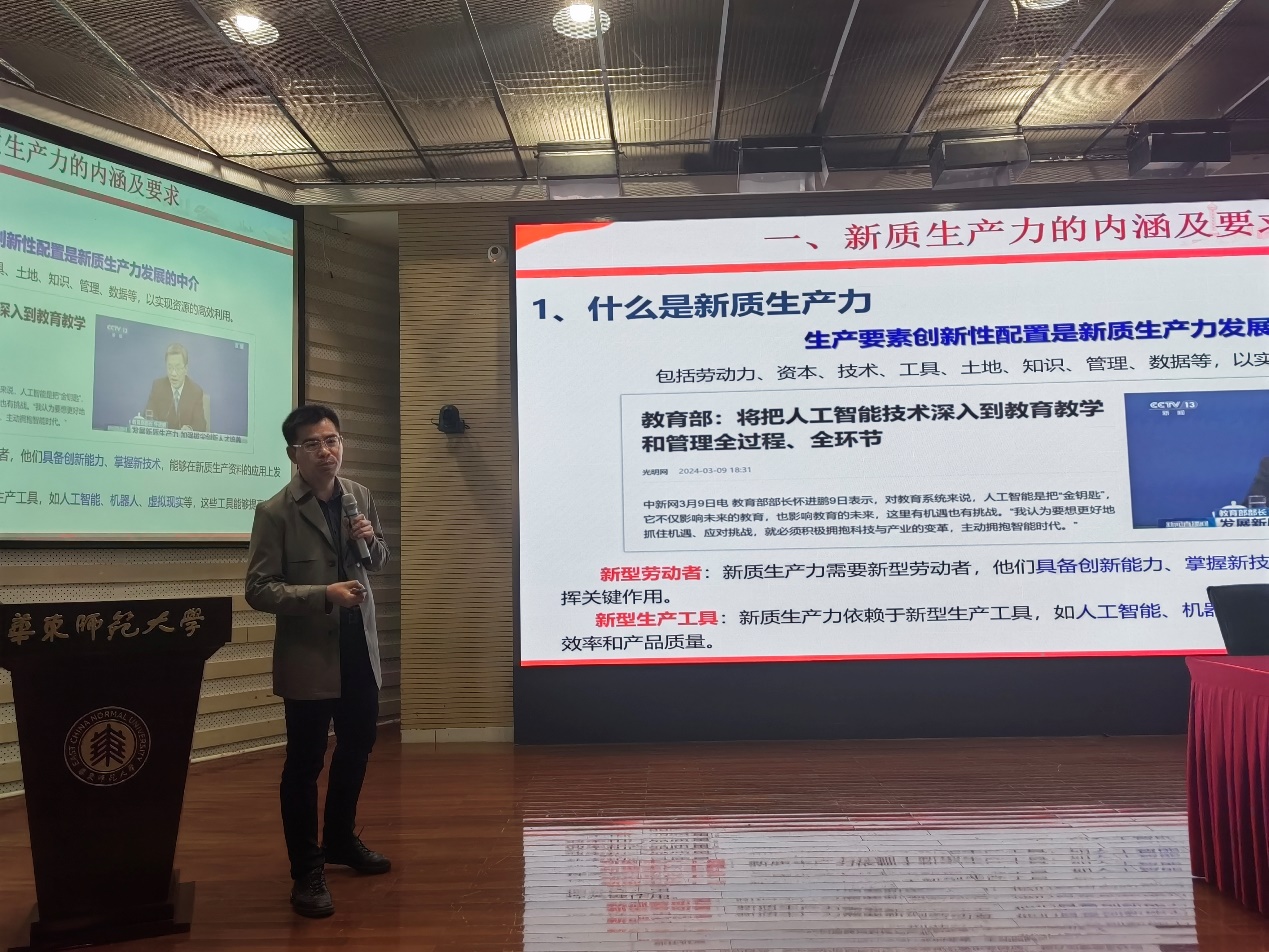 接着,化学与分子工程公司挂职副经理、贵州六盘水师范公司化学与材料工程公司经理雷以柱教授为学员们进行首场讲座,报告主题为“深刻把握新质生产力的内涵及要求,为推动高质量发展贡献高校力量”。雷老师结合自身教学和科研的相关工作,深刻阐释了新质生产力的内涵及要求,以及高校在锻造新质生产力方面的应有之力。他特别讲到,高校是发展新质生产力的重要力量和关键路径,鼓励参训学员,心怀“国之大者”,抓住师大的宝贵环境,在学习科研和生活中提高自身综合素质和创新能力,做“与国家民族同呼吸共命运”的“强国一代”。