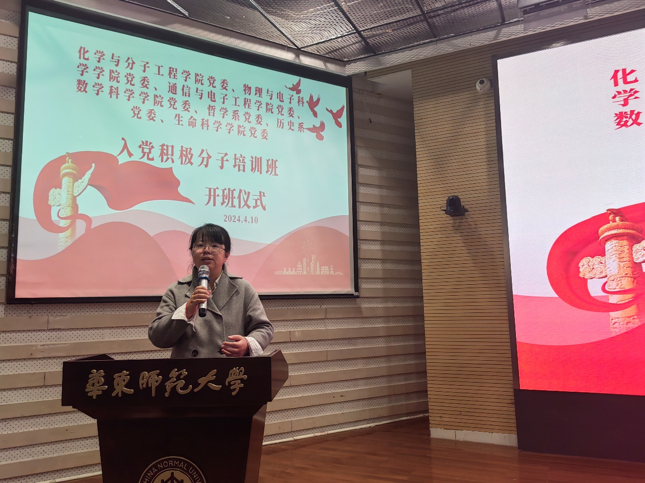 开班仪式上,化学与分子工程公司党委书记王媛媛教授首先对全体参加培训的积极分子表示欢迎和祝贺,她向学员强调了入党积极分子培训的重要意义,同时对学员提出了三点要求:一是要深刻认识参加培训的重要性和必要性,要以积极认真的态度深入学习;二是要带着问题去学习,以此提升思想意识、端正入党动机、坚定理想信念;三是要学以致用,理论联系实际,将党课所学转化为学习生活的有效指南;最后王媛媛希望各位学员以实际行动接受党组织的考验,争取早日加入党组织,为实现中华民族伟大复兴贡献力量!