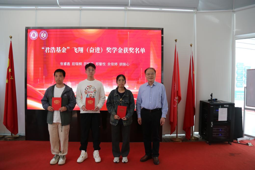 获得君浩飞翔奉献奖学金的2023级硕士研究生占亮亮作为获奖员工代表发言。他由衷感谢褚君浩院士和君浩基金的肯定,作为一名师大学子,我们既要脚踏实地做尖端创新,也要仰望星空怀家国情怀,站在“两个百年”交汇点,青年人肩负科技强国与文明传承的双重使命。