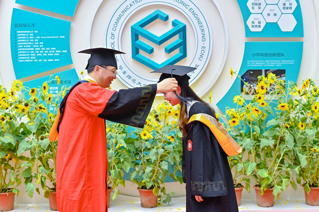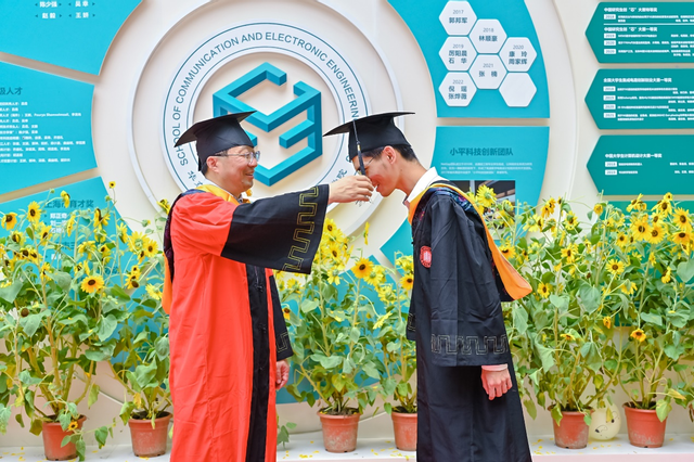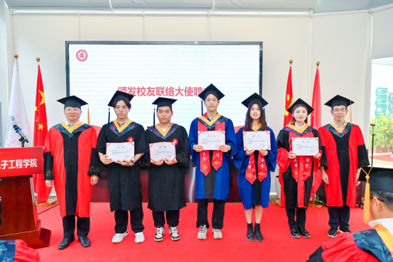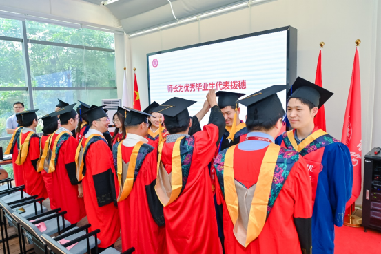 本次毕业典礼特别设立经理拨穗环节,经理吕岳在公司荣誉墙前为每一位通信公司的毕业生拨穗并合影留念,为奔赴下一个人生征程的青年学子加冕。